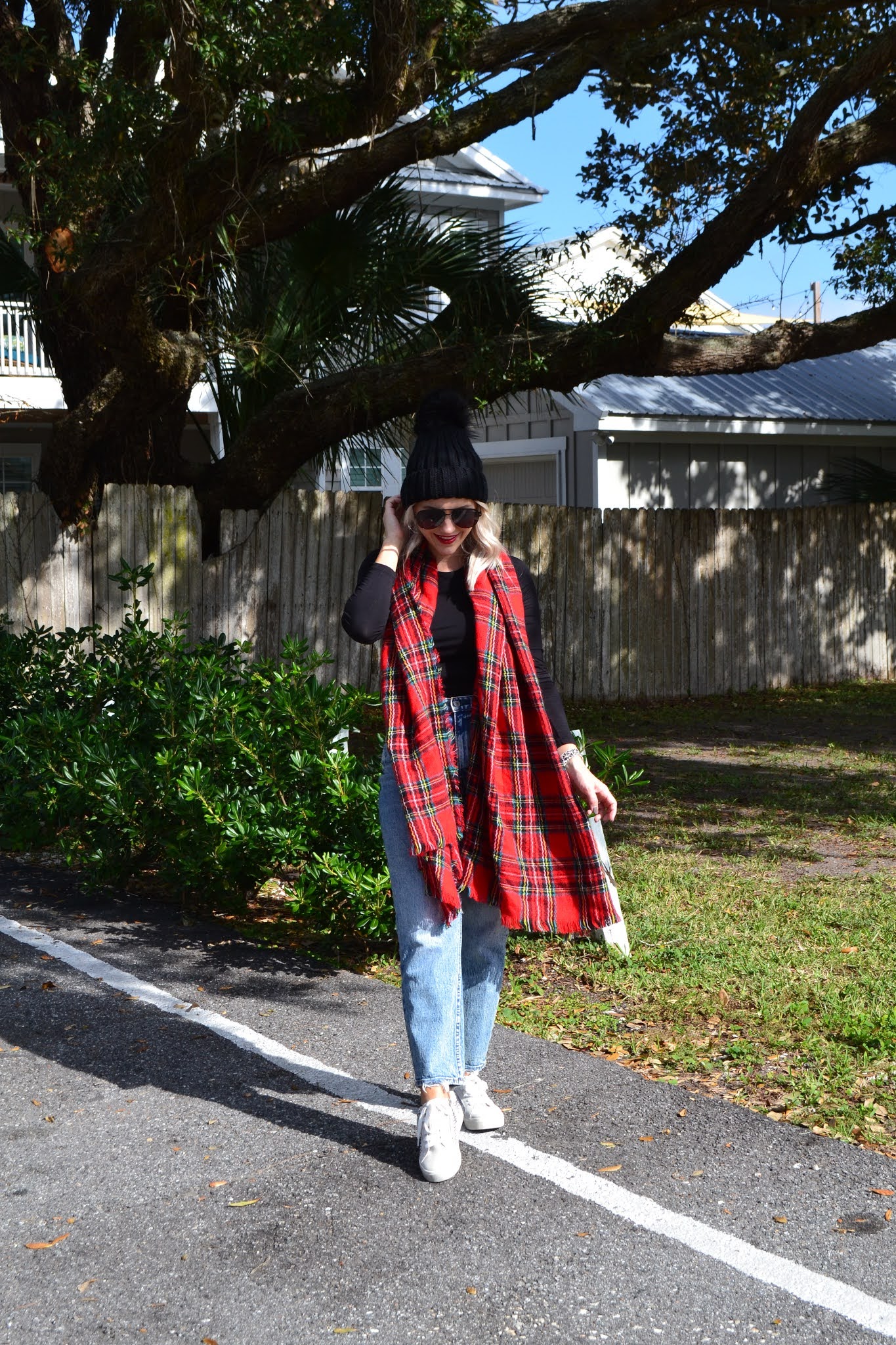 One way to really get in the spirit is with a good outfit. Sometimes an ugly Christmas sweater or full red & green outfit is a bit too much for me. So today I am all about a good Christmas or holiday accessory. A scarf, beanie, headband, or other accessory can be just the thing you need to add a dash of holiday cheer to your outfit. I opted for a plaid scarf and pom pom beanie for today's look. While the beanie I would wear all winter long the scarf really says I'm in the Christmas spirit!
