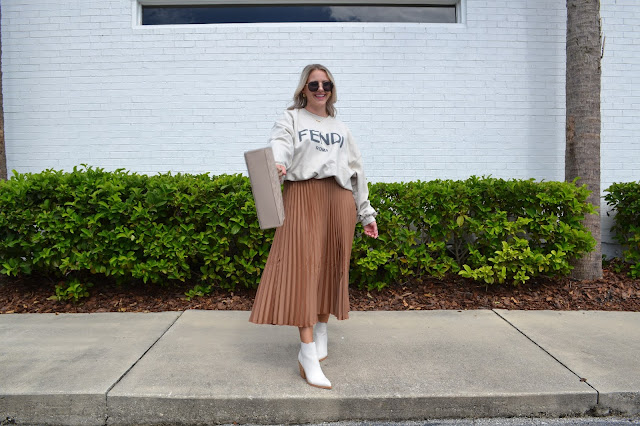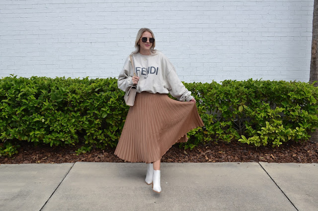 Skirt: H&M (I also really like this one.) | Sweatshirt: Benton & Spring | Booties: Marc Fischer *currently on pre-black Friday sale! | Sunnies: Quay Australia | Bag: Tory Burch | Earrings: Amazon | Necklace: Parkside Harbor | Lips: Ulta Automatic Lip Liner in Raspberry with Charlotte Tilbury Hot Lips Lipstick in Secret Selma & Too Faced Lip Injection Power Plumping Lip Gloss in Wifey for Life